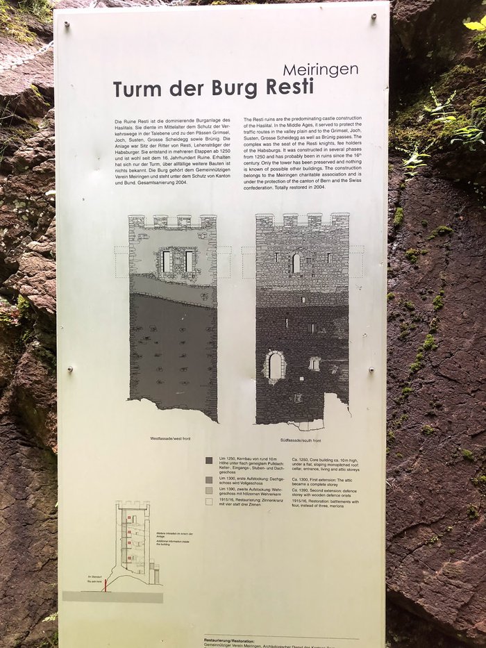 Resteturm is a ruined castle in the canton of Bern. It was built in the thirteenth century and rebuilt several times after that, and is distinguished by its tower, which still exists to this day. The castle was the seat of the Habsburg Knights Rusty, and in the sixteenth century it was abandoned It was left in ruins until it was restored in 1914 and in 2004 information panels, steel stairs and a balcony were added.