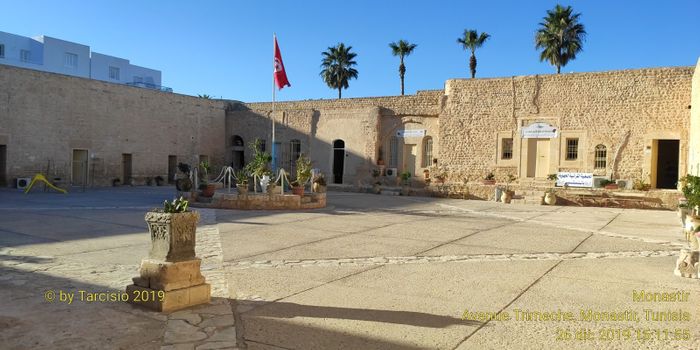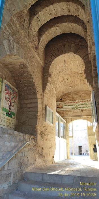 The Ribat of Sidi Dhouib is located in the city of Monastir, between the mosques of Bourguiba and Sidon, near the 7th of November Square. Its origins date back to the ninth century when it was operating as a military base. It is one of the most important tourist attractions in the city, although it was not as large or famous as the Ribat of Monastir. It has a strong, majestic, and devoid of ornamentation, rectangular structure with thick stone walls and a series of semicircular towers.