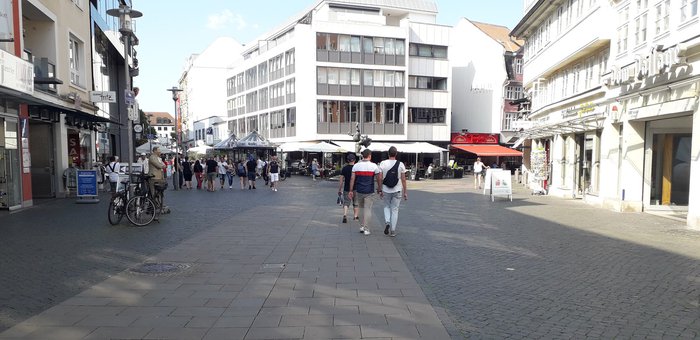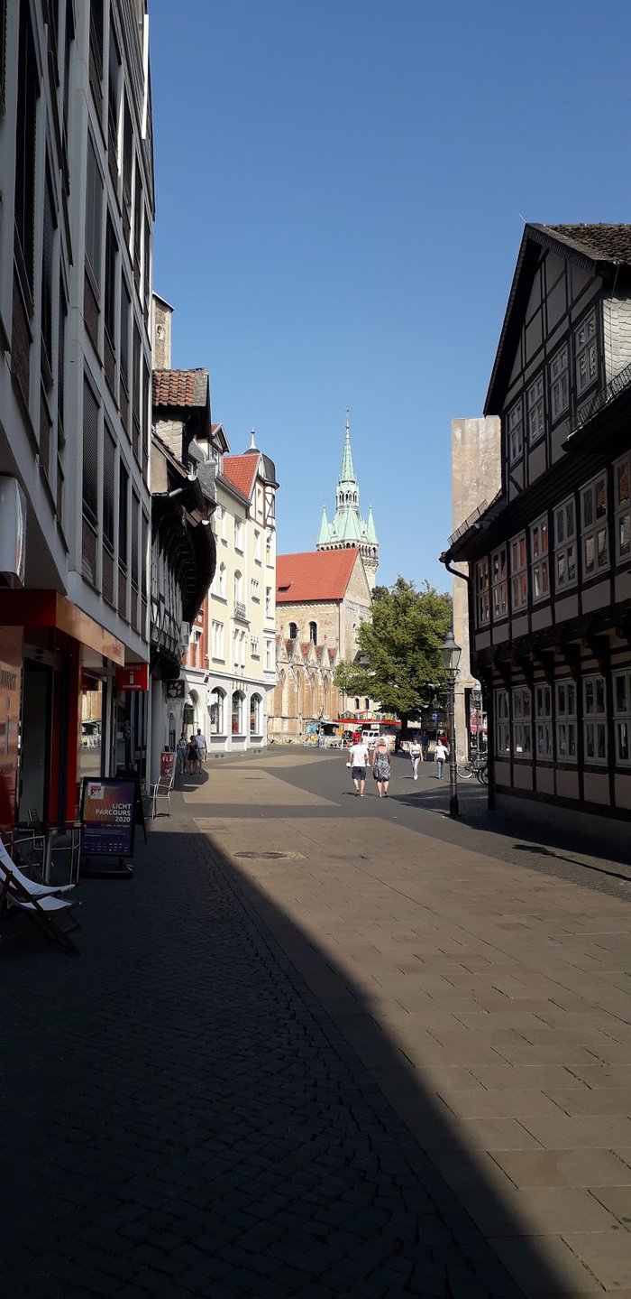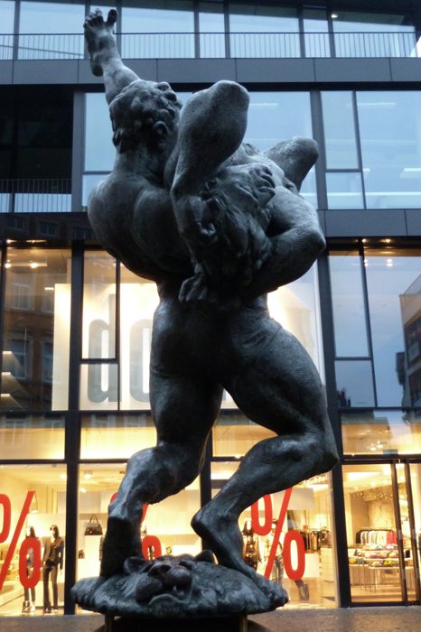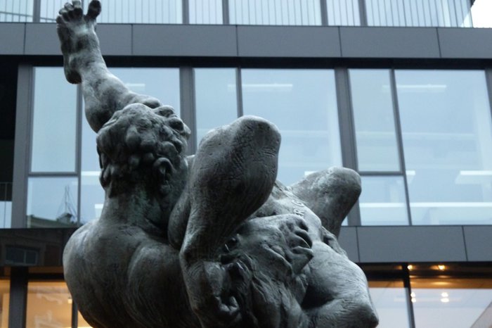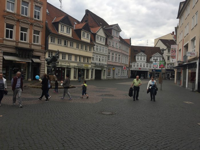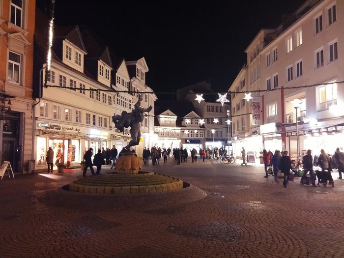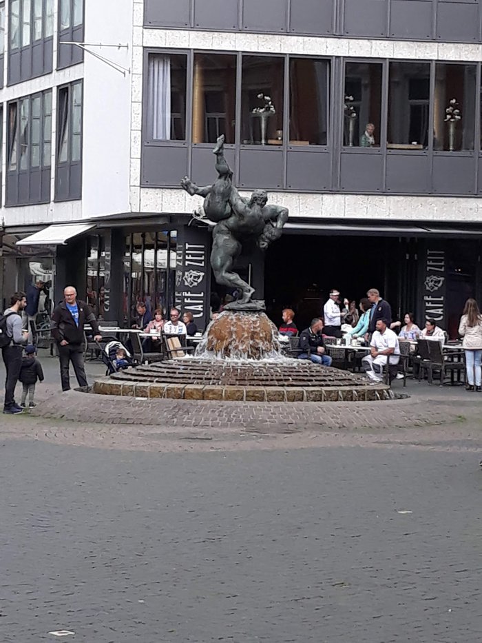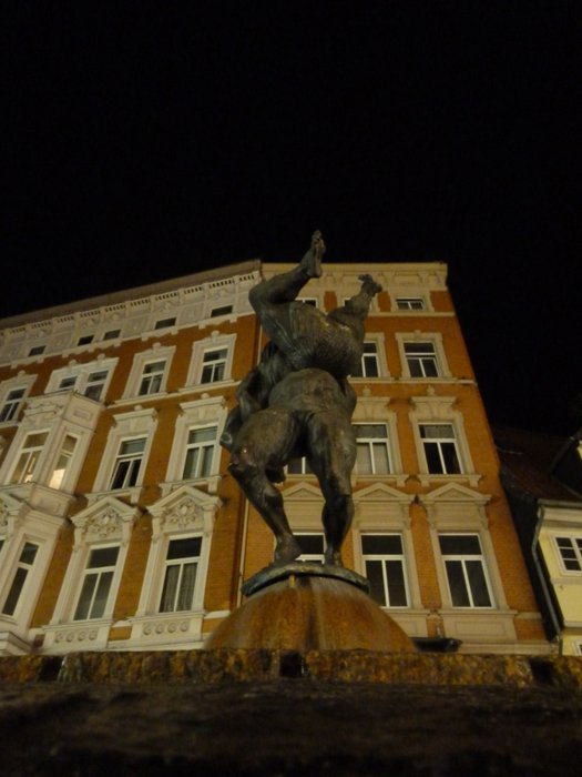 The Bell-Ringer Fountain was built by Braunschweig sculptor Professor Jürgen Weber in 1975. Standing on a cobbled dome surrounded by a small moat, the bronze statue depicts two figures grappling, one of whom lifts his counterpart into the air, thus depriving him of the strength to attack. The idea can also be understood in a metaphorical sense as a struggle between the artist and his critics, as the artist pulls the ground from under his critics and does not allow them to influence him.