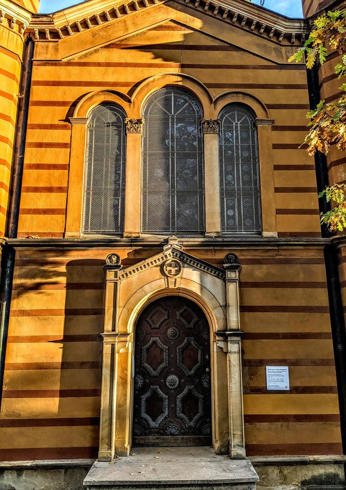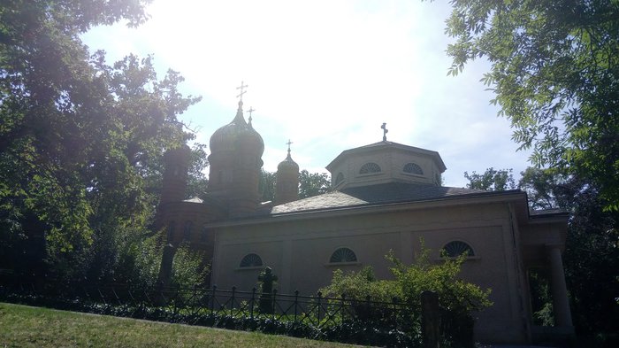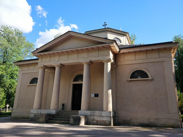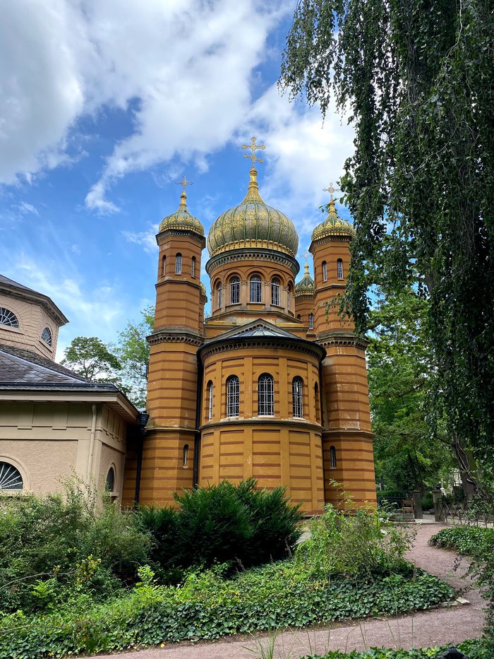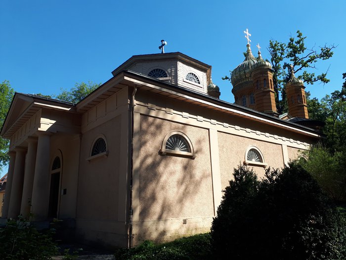 The Russian Orthodox Church was built in Weimar in 1860 AD for the Russian Duchess Maria Pavlovna, and it is a funeral church located inside the historic Weimar cemetery. Maria Pavlovna's coffin is located in the corridor in addition to the coffin of her husband, Charles Frederick. The church is characterized by a charming architectural building inside and out.