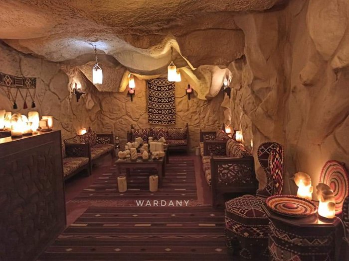 The Salt Cave, located in the Giza district of Cairo, enjoys a calm and relaxing atmosphere, which attracts many individuals looking for ways to help them relax, as the place has unique decorations that make the walls look like the walls of ancient castles, with colorful lighting, between pink and yellow, and in The earth is piles of natural salts, on which individuals sit.