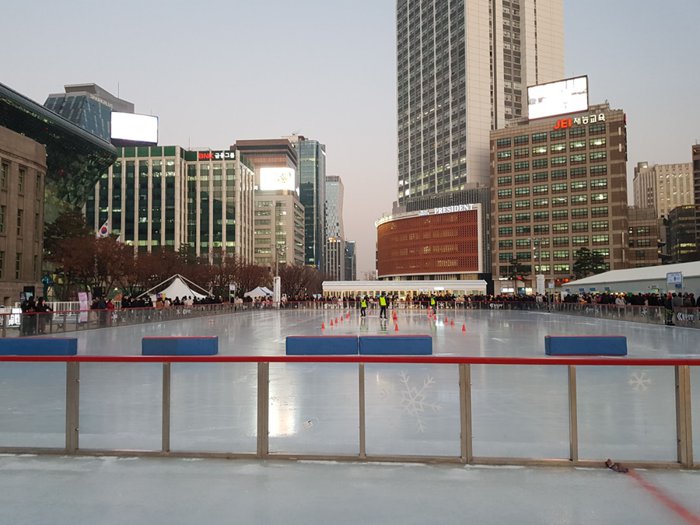 Established in 2004, Seoul Plaza is an oval-shaped public square located in front of the City Hall in the heart of Seoul. It hosts a wide range of cultural events including festivals, concerts and public exhibitions. It also turns into an outdoor ice rink. Every winter, it is a popular attraction in the city, and in the past it had a large fountain in its center, but this has been replaced by a fountain on the sidewalk that shoots water into the air through a number of holes in the ground, and in 2004, the area was renovated and became vehicle-free.
