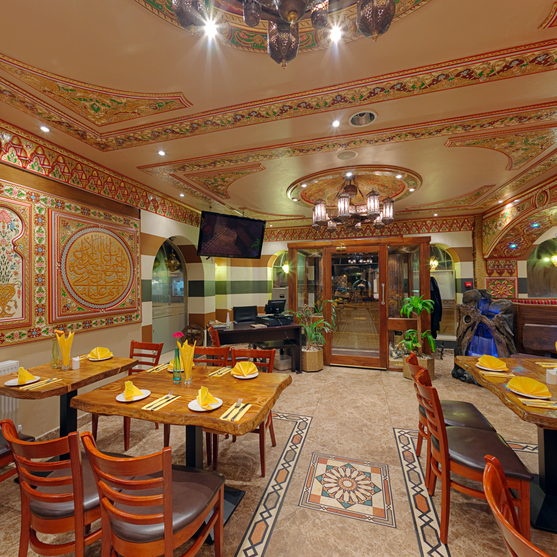 Layali Al Sham Restaurant is distinguished for being one of the 3 best oriental restaurants in the United Kingdom. Kebabs, Arabic shawarma rolls, kofta, moussaka, and shish tawook. It also serves a range of salads such as fattoush, tabbouleh, and Arabic salad, as well as appetizers such as hummus and Arabic pita bread. This restaurant is distinguished by its beautiful Arabic design, as its walls are decorated with Arabic calligraphy decorations, and it contains chandeliers Large, Levantine-themed chairs.