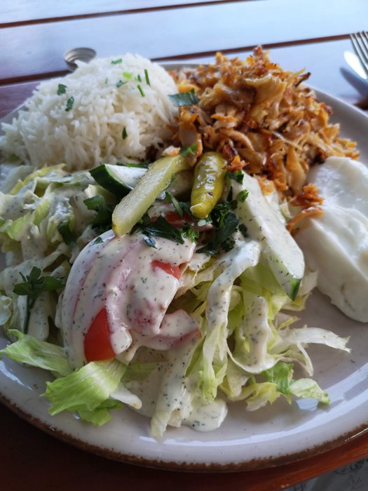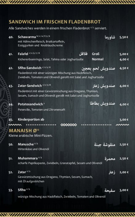 Shahrazad Arabic Restaurant offers many distinctive oriental foods, including falafel, burger sandwiches, meat with dough, fries, cheese manakish, sfiha, zaatar, muhammara, and many other meals.
