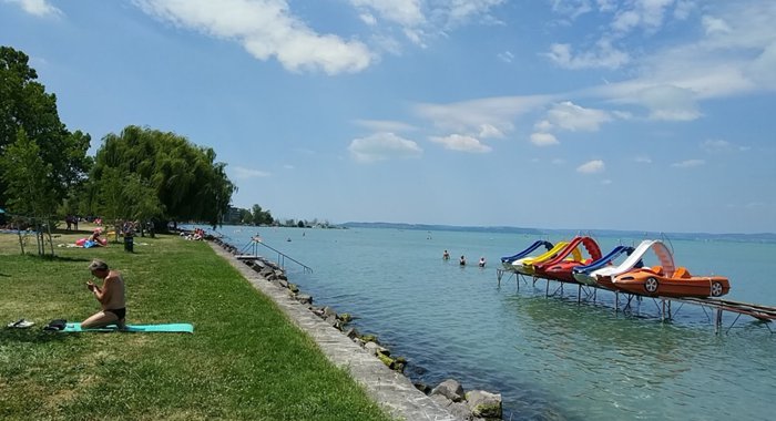 Siofok Beach has a length of 4 kilometers, and its width ranges from 20-30 meters. It is also distinguished by its waterfront surrounded by trees that provide cool shade for tourists. Many activities can be practiced when visiting this beach, such as water skiing, enjoying a wonderful sunbathing, swimming, playing ball, and others. This beach is surrounded by many facilities, such as buffets, shops for renting sports equipment, skates, toilets, restaurants, and distinctive cafes.