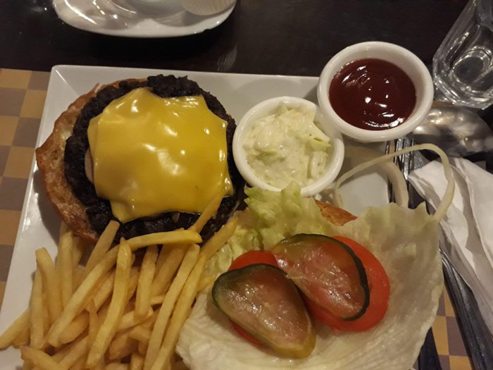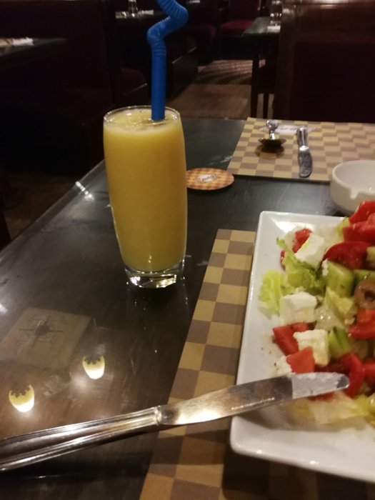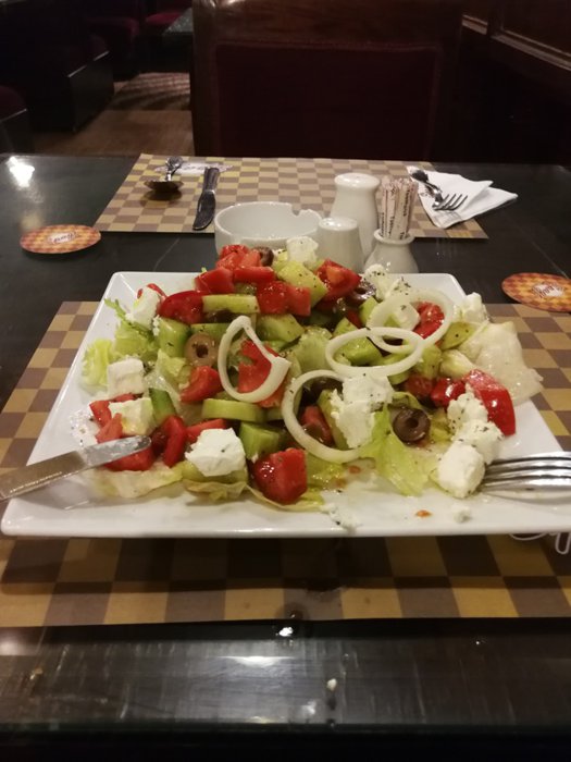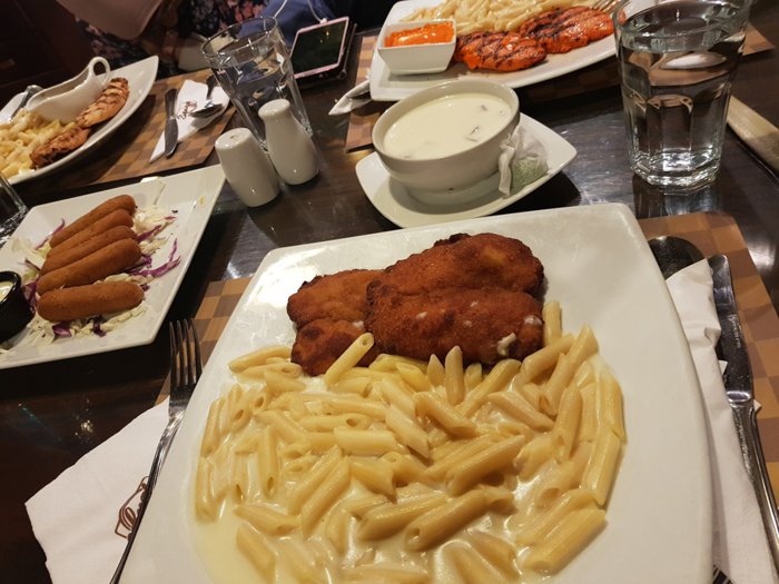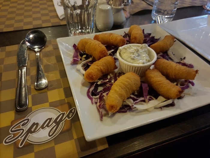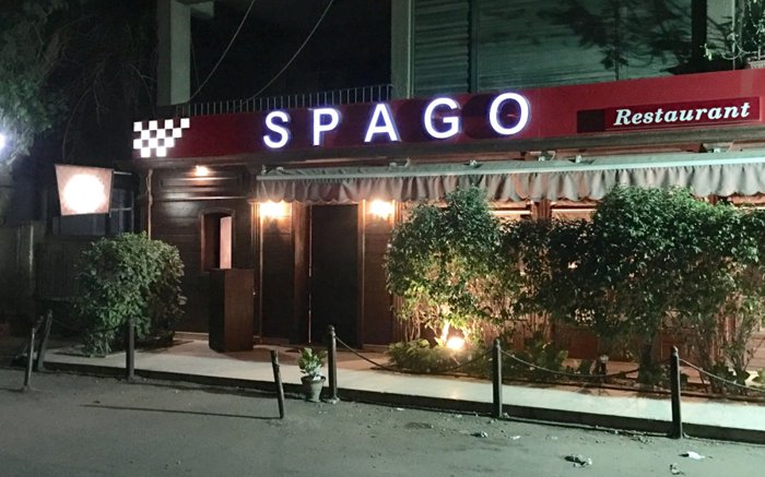 Delicious burger with crispy potatoes and pickles, steak with grilled vegetables, salmon with rice, spaghetti with shrimp, in addition to fried cheese sticks, healthy spring salad, and many other items, is what the Spago restaurant menu offers, which customers can order through the service Delivery, or in indoor seating with red decorations and comfortable seats.