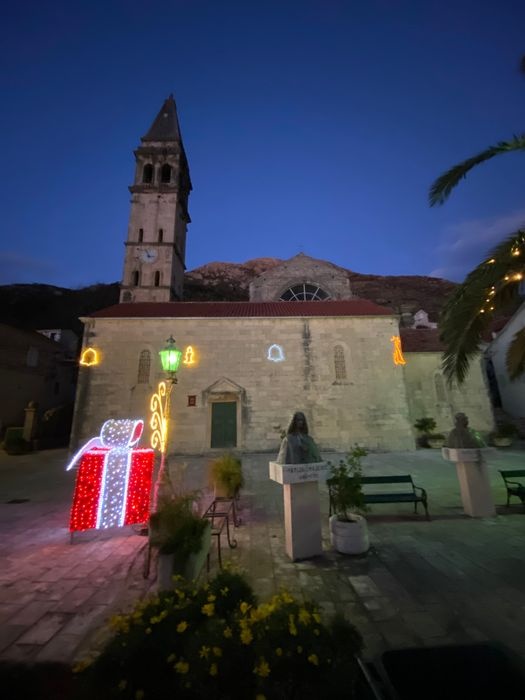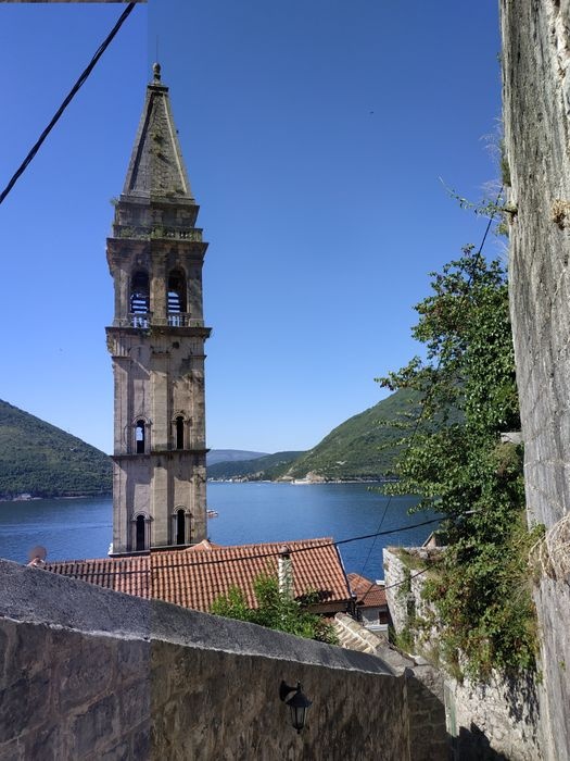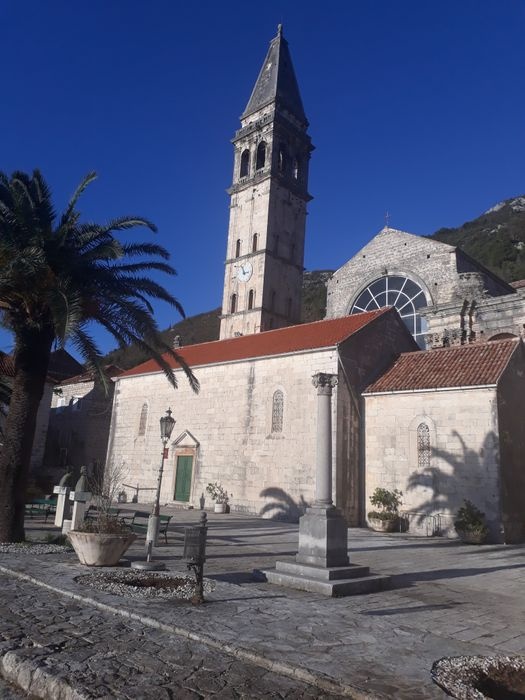The Church of St. Nicholas is the largest church in the old city of Perast. It is located in the central square and has a large bell tower. It gained its present appearance in 1616 after being built on the ruins of an earlier church from 1564. Next to this old church there is an unfinished church at the back, designed by Venetian architect Giuseppe Beati, and the bell tower was built in 1691 by Ivan Scarpa, and is 55 meters high. Although it was built during the Baroque period, the bell tower is characterized by Renaissance and Romanesque styles.