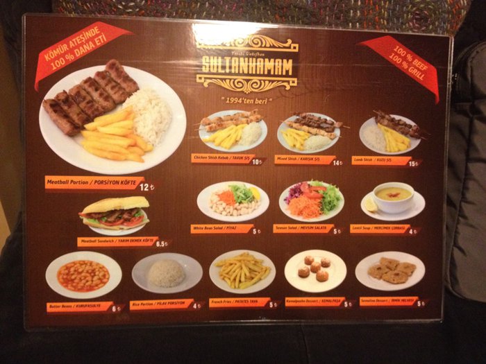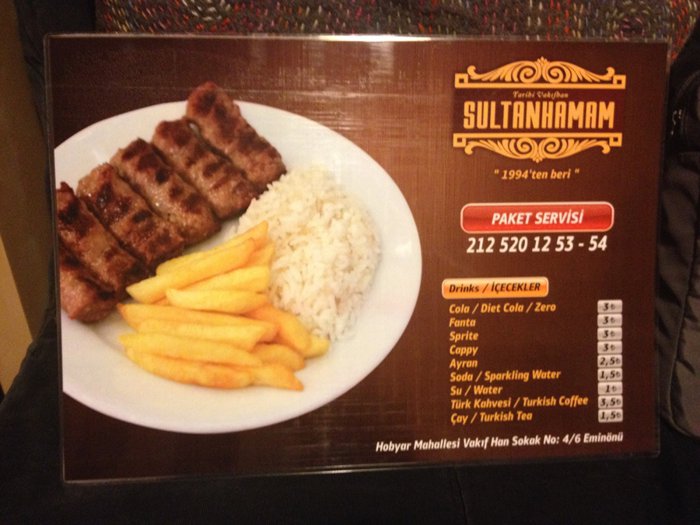 Sultan Hammam Restaurant is a small restaurant in the corridors of the large city of Istanbul. The restaurant has outdoor seating along the street and indoor seating. The restaurant offers its customers many traditional Turkish dishes at reasonable prices, which can be eaten in the restaurant or taken outside, and the menu is displayed on the walls at the top of the restaurant. For easy ordering, especially at peak times, from kebab and shish tawook dishes, which are served with rice and fried potatoes, in addition to falafel, bean soup and various salads.
