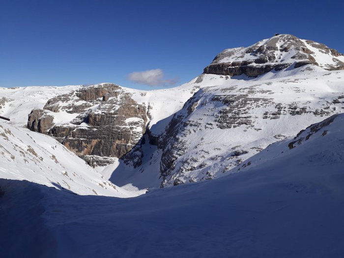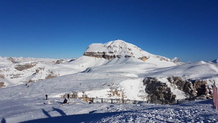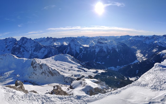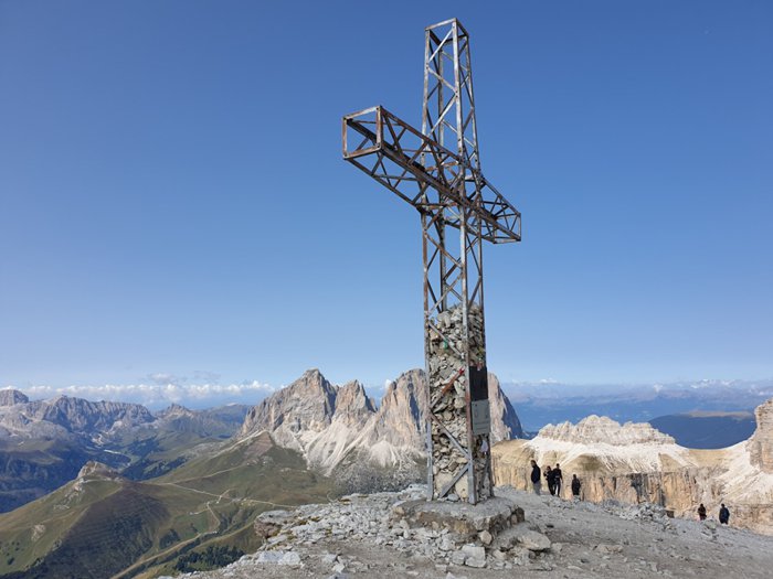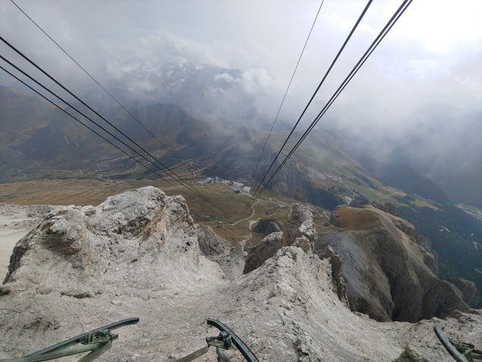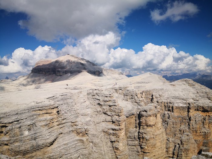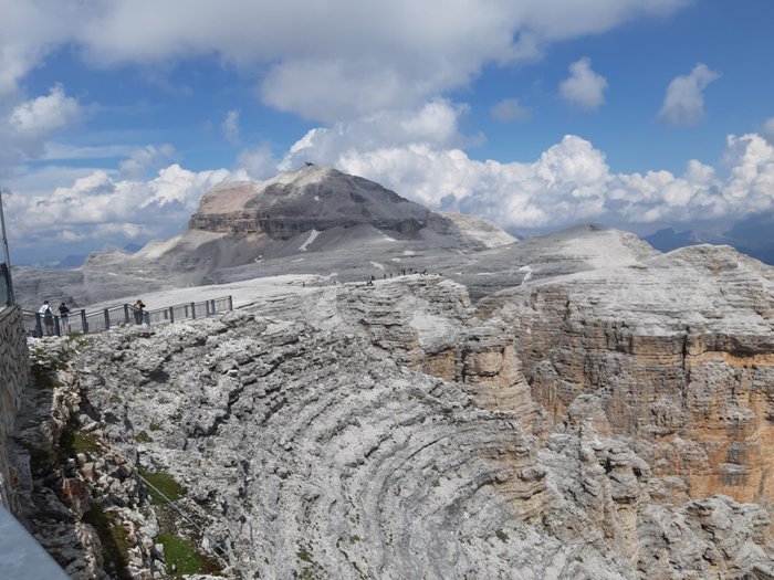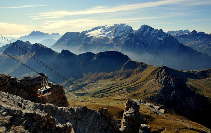 The view of the Dolomites can be reached by walking in the Pordoi Pass and climbing the surrounding rocks, or by taking the modern cable car, which saves time and effort, in order to enjoy the wonderful 360-degree views of the mountains, the sky decorated with clouds, and the distant horizon, and from a height of up to 2950 meters above sea level.