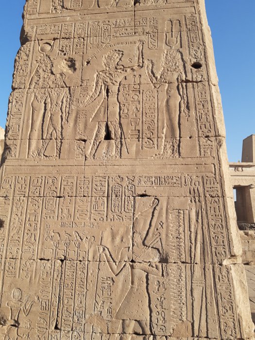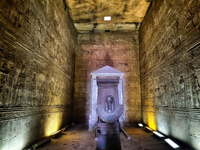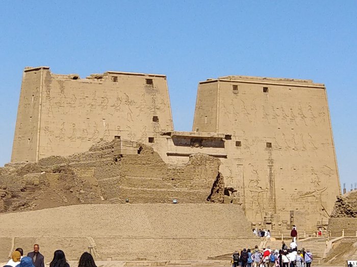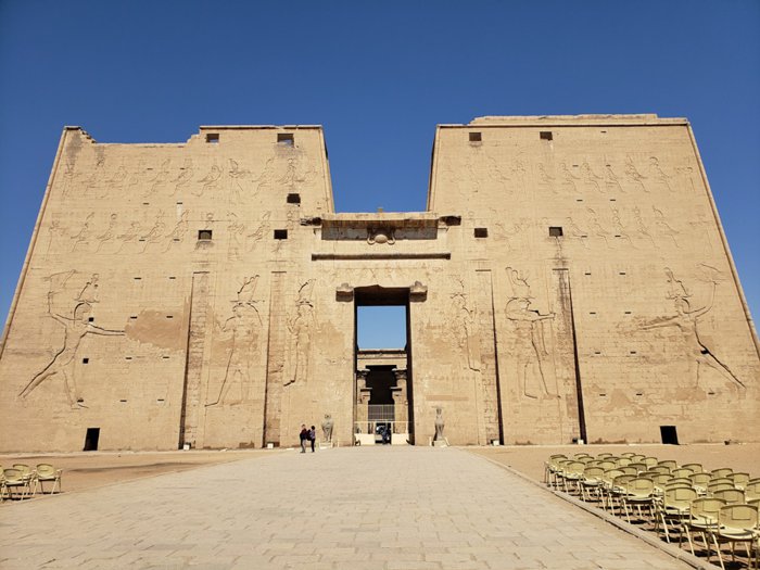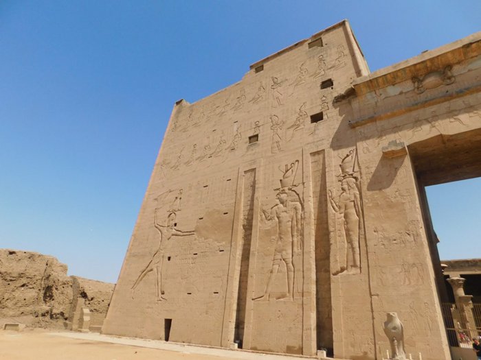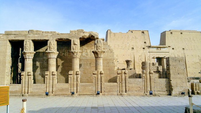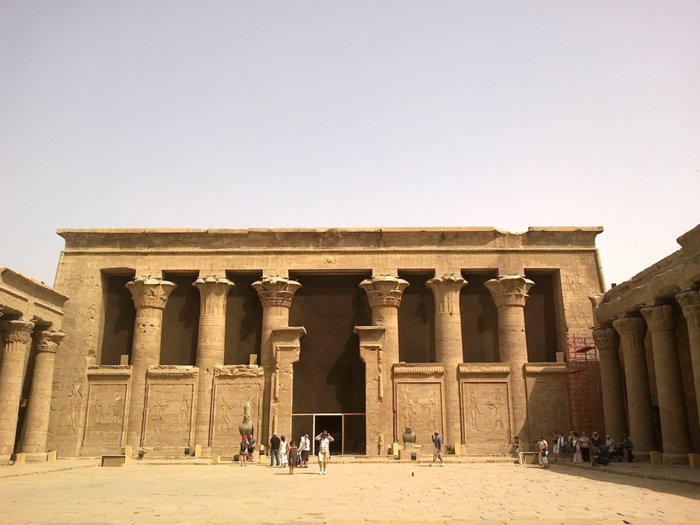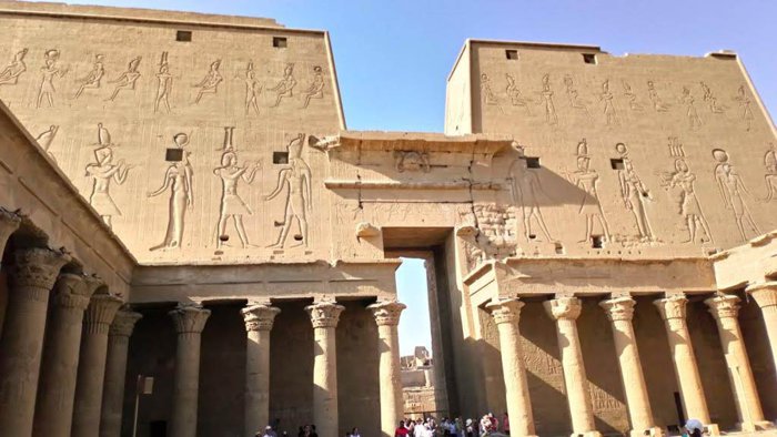 112 km north of the city of Aswan, the Edfu Temple is located, which is considered one of the most important temples in Pharaonic history, as it is considered the most beautiful in terms of construction, as its sandy walls contain many unique inscriptions, the most important of which are the inscriptions of the guards of the god Horus present at the gate, and inside There are approximately 32 archaeological columns that erect the building, covered with inscriptions that speak of the victory of the god Horus in his battles.
