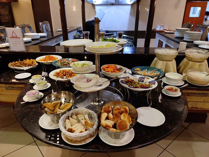 Time Traveler restaurant customers enter the main dining hall to find many varieties and types of food waiting for them, as food is served here within an open buffet, from which customers choose what they want to eat from among Chinese, Asian, Japanese, local, Indian and international recipes, ensuring that there is always something that satisfies the tastes of all customers.