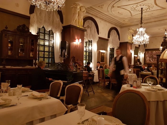 The Tsar Restaurant, which is one of the finest and most luxurious restaurants in the city of St. Petersburg, the restaurant enjoys very wonderful sessions and a very warm and pleasant atmosphere, where elegant furniture and wonderful decorations of ceilings full of marbles, and columns with elegant statues, in addition to the paintings that cover its walls, and many details The unparalleled property, which makes you feel as if you are eating your favorite meal in an ancient royal palace. The restaurant offers many delicious dishes prepared under the hands of the most skilled chefs and in the finest ways and the most elegant details, and among its dishes are meat and chicken steak with delicious cream, fried fish dishes, Russian pastries (pelmeni), shashlik dish (barbecue skewers), blini dish, and dishes hot soups, and many more. It is a very wonderful place, we advise you to visit it.