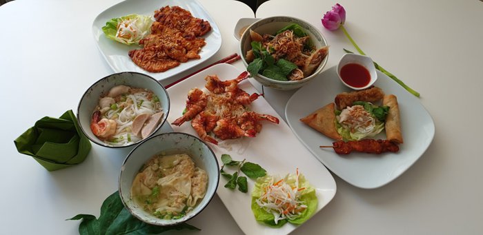 Van Lang Tradition Fit Restaurant is a restaurant that specializes in serving traditional Thai dishes, for locals or tourists, sitting on the green seats, which are distributed in the inner hall of the restaurant. The menu includes Thai food, dishes from Som Tam salad, seafood soup, Noodles Bay Thai Thai, Chicken Coconut Soup, and many more, served with appetizers and refreshing drinks.