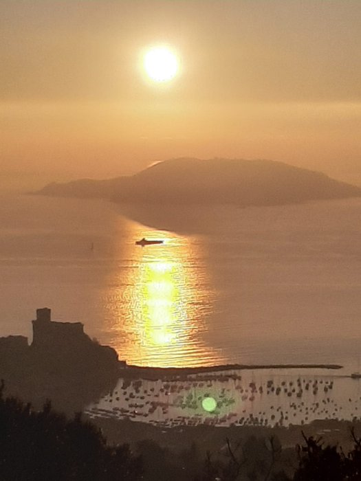 panoramic view of the Gulf of Lerici, with wide views of about 360 degrees, where visitors can see the bay, the harbour, sailboats and the old houses of the town, from a height, and enjoy the sunset as it disappears on the horizon and the reflection of the colors of the red clouds on the water in the bay.