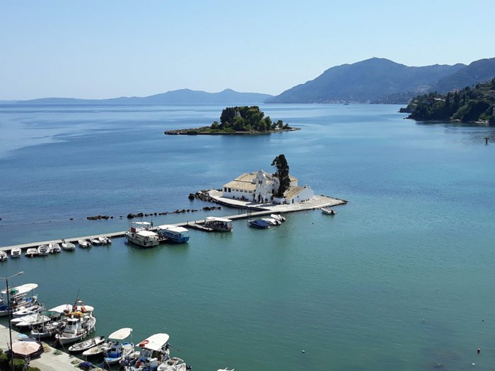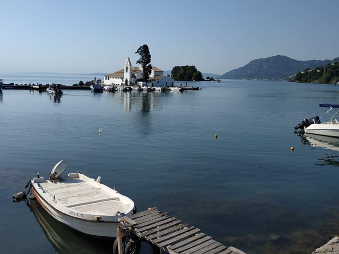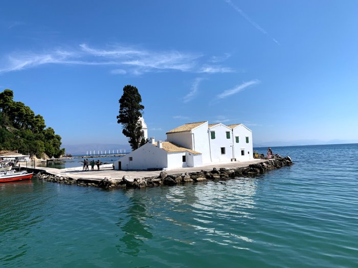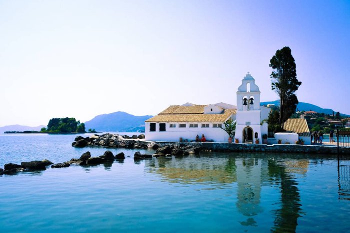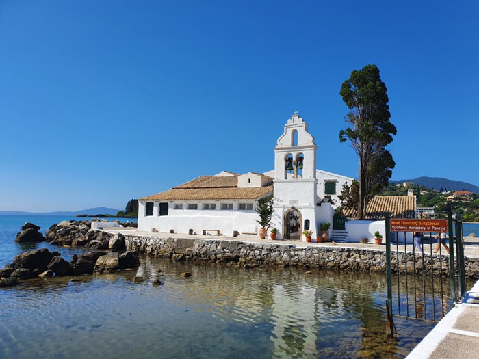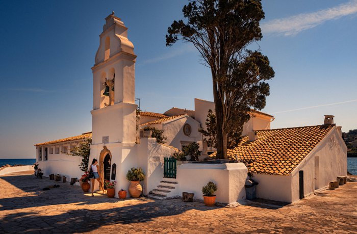 The Vlacherna Monastery forms a small peninsula in the sea, in the middle of which is an eye-catching white building that attracts tourists in large numbers on a daily basis. It is really interesting to walk along the stone pier leading to the monastery with family members or friends, as the clear sea water surrounds the pier on both sides, making it a comfortable place for picnics and taking souvenir photos that document an unforgettable experience while visiting Greece.