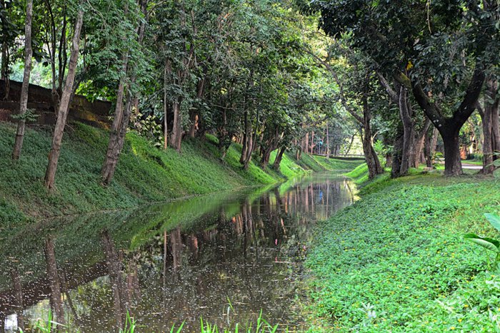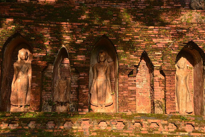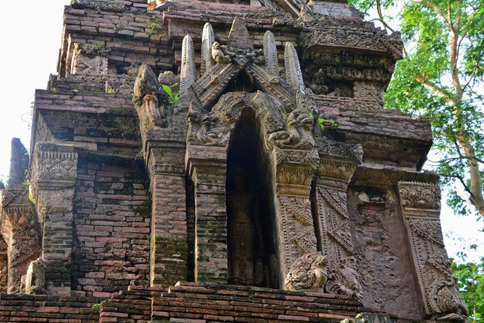 Secluded outside the ancient city walls of Chiang Saen, Wat Pa Sak, or "Teakwood Temple", owes its name to the 300 teak trees planted at the time of its founding in 1295, although only one pyramidal chedi has been preserved in the city. This temple, however well worth exploring, is a Lanna-style architectural gem, perfectly combining the three art styles of Bagan, Haribunchai and Sukhothai, and delicately decorated with carvings of flowers and mythical animals.