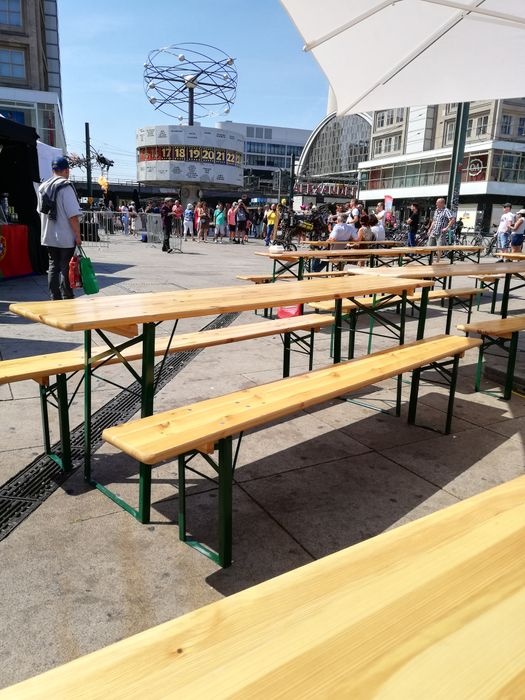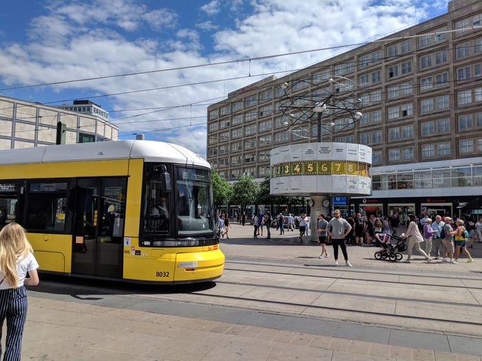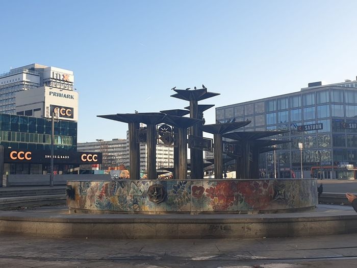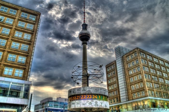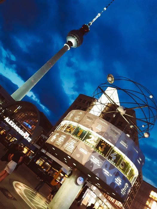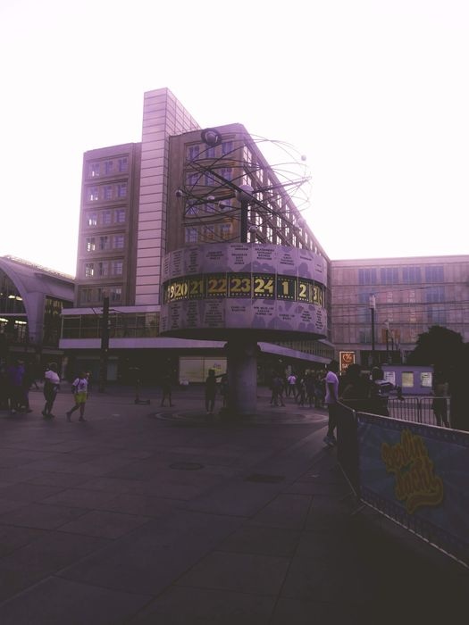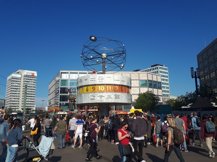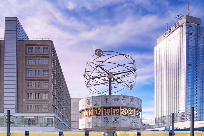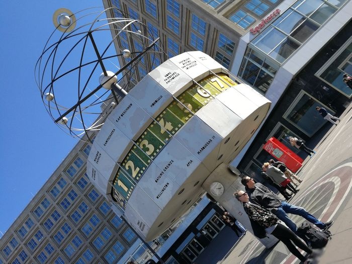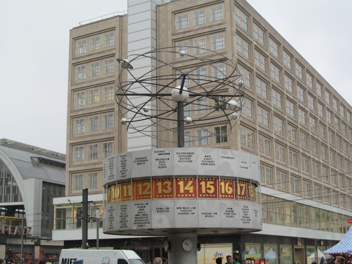 The World Clock, also known as the Urania World Clock, is a large tower-style world clock located in the public Alexanderplatz in Mitte, Berlin. By reading the markings on the metal dome, the current time can be determined in 148 major cities around the world. Designed by Erich John, it was built by about 120 experts of various professions. At the bottom of it there is a stone mosaic, while at the top there is a statue of the solar system.