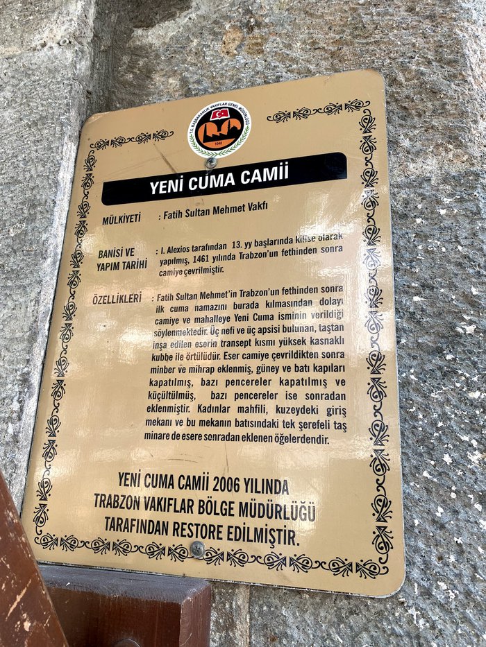 The Friday Mosque is an ancient historical mosque in Trabzon. It was built during Byzantine times as the Church of Hagios Eugenius dedicated to Saint Eugenius, the patron saint of the city. After the city was captured by Sultan Mehmed II in 1461 AD, it was converted like many churches in that city. to a mosque; Today, the mosque is considered one of the most important religious tourist attractions that tourists visit in Trabzon.
