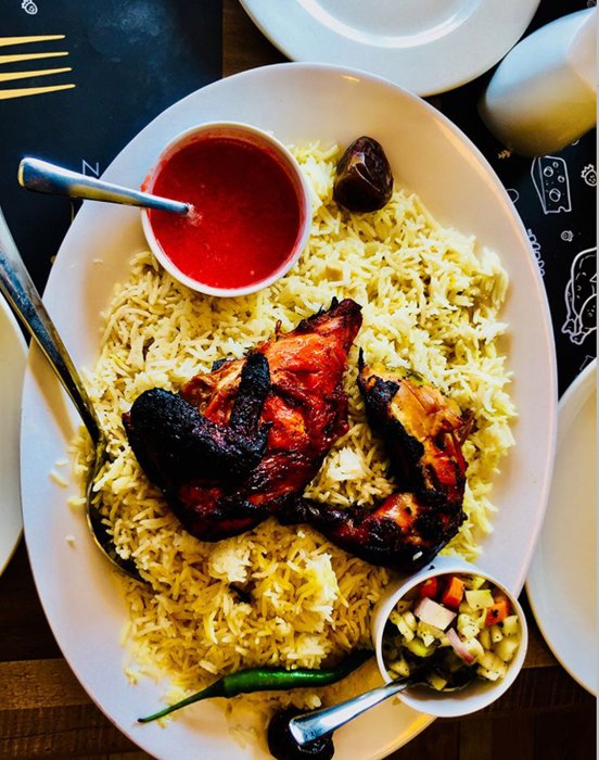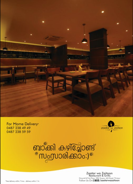 wonderful restaurant in the heart of the Indian city of Thrissur. This restaurant is distinguished by its elegant environment, fast service, and delicious dishes. It offers traditional Levantine dishes on the menu, but it presents them in a very beautiful modern way. The restaurant has an outdoor patio overlooking the city, where you can enjoy eating delicious dishes while enjoying the outdoors. It is advised when coming to this restaurant to eat the fried halloumi dish, which is prepared in the traditional way, and among the other dishes offered there are kebabs, manakish, kibbeh, and others.